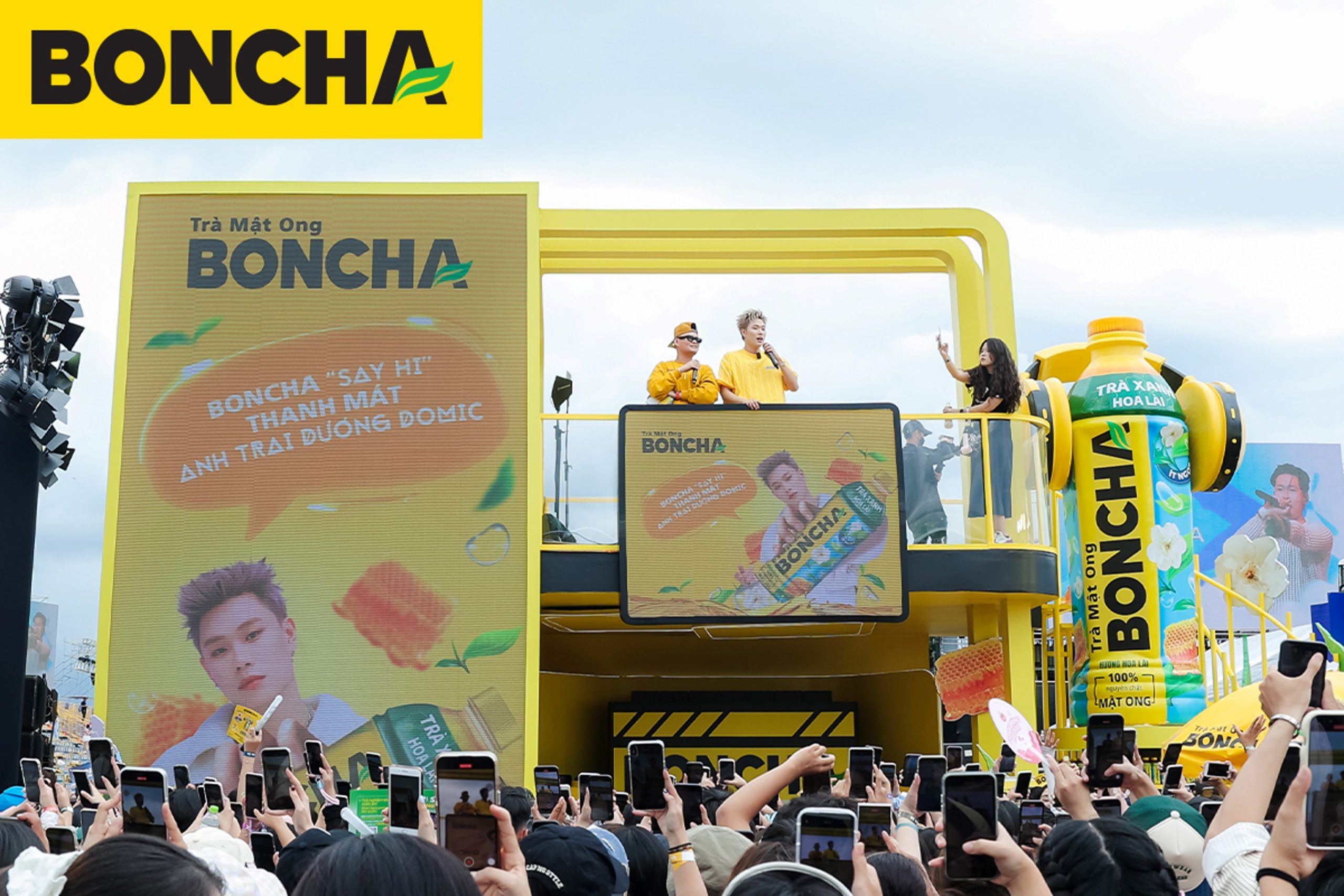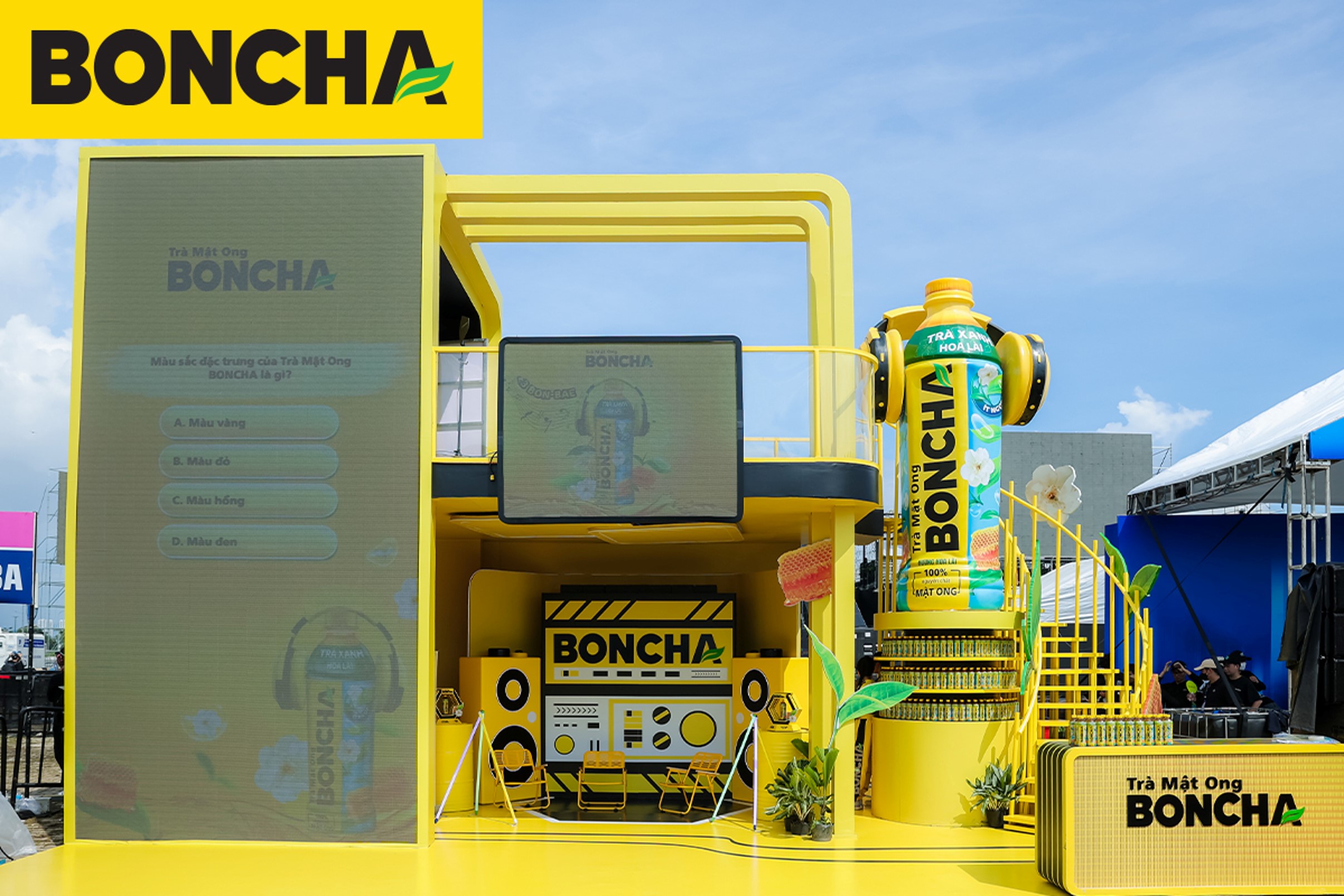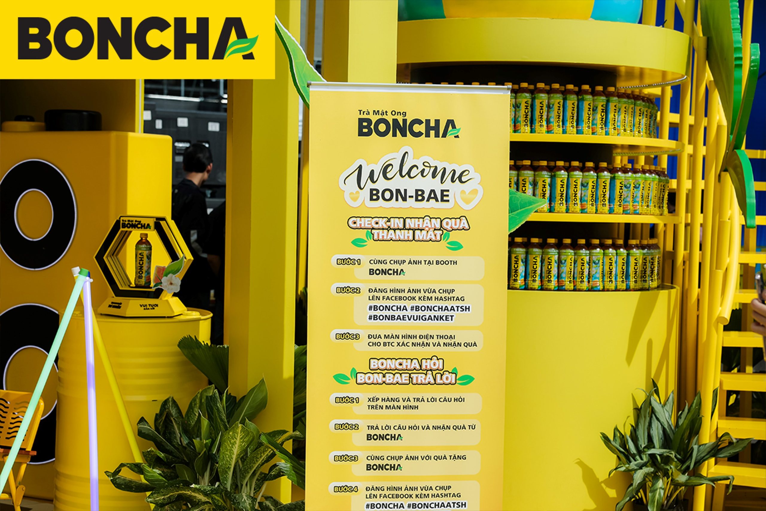 Điểm nhấn: Booth hoạt động 2 tầng và chai BONCHA khổng lồ, trình diễn mở màn sân khấu bằng âm nhạc DJ sôi động.