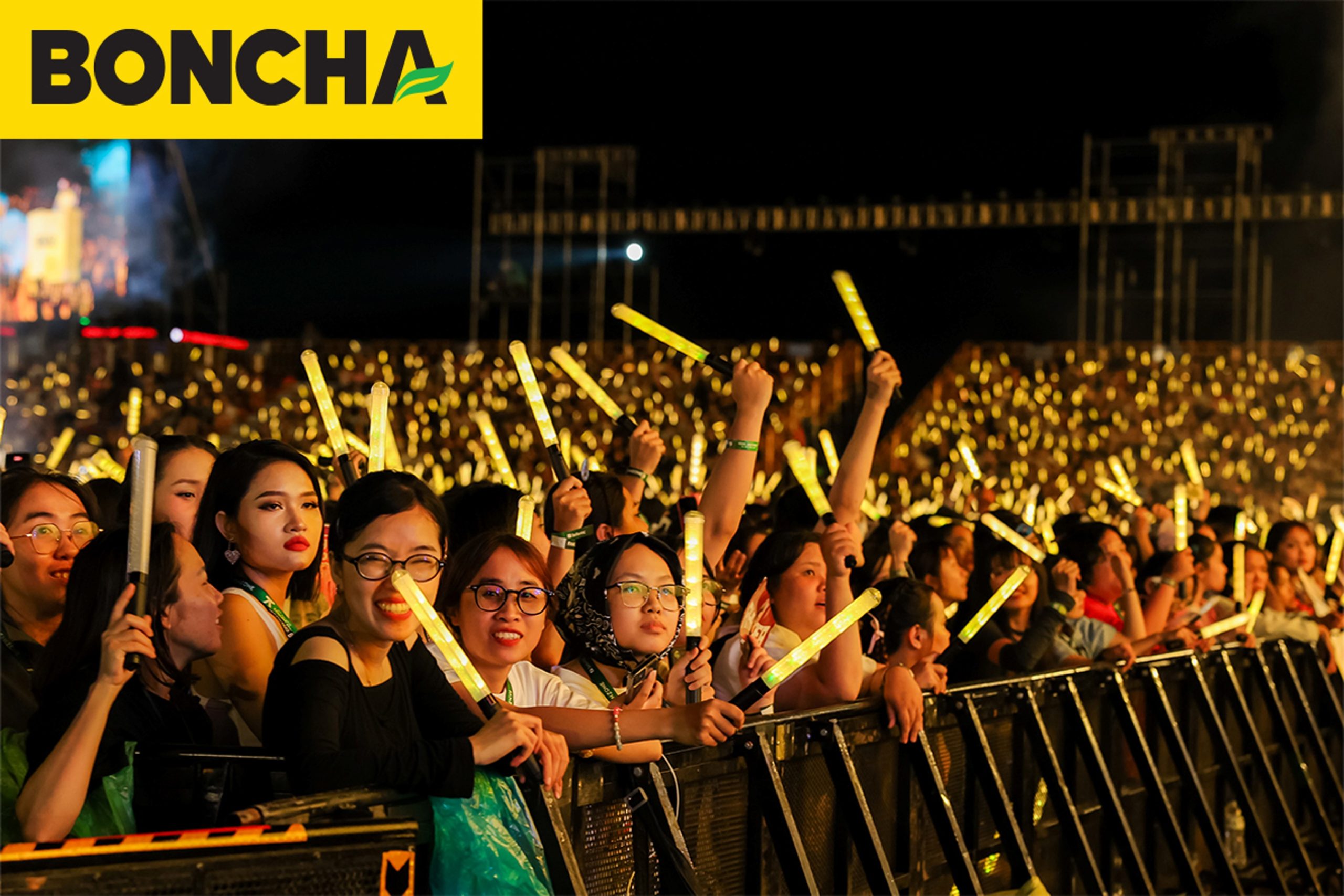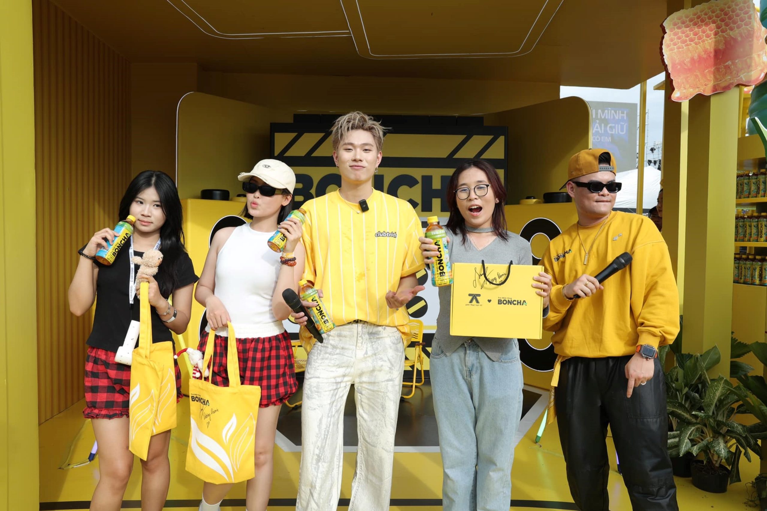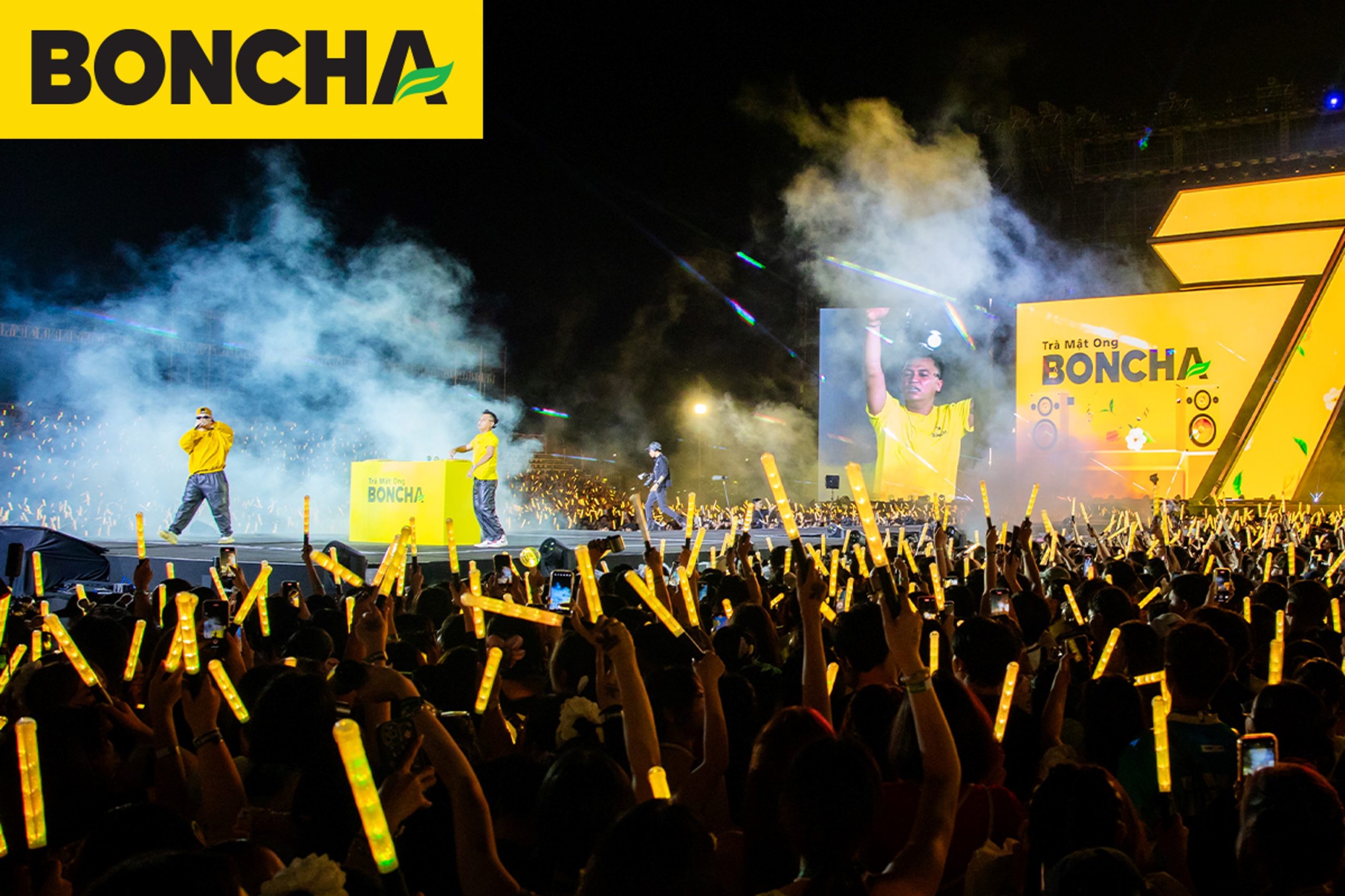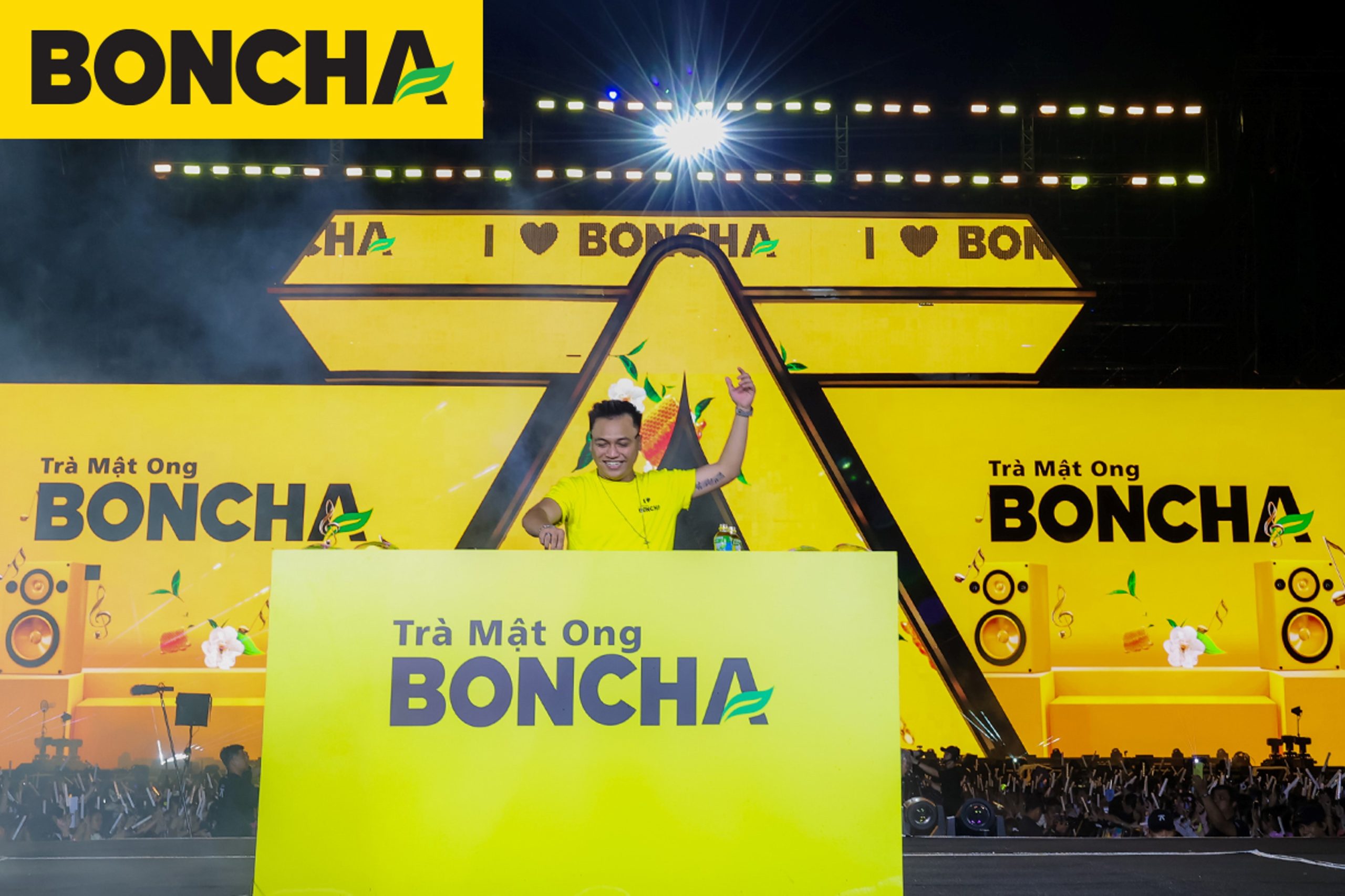 Điểm nhấn: Booth hoạt động 2 tầng và chai BONCHA khổng lồ, trình diễn mở màn sân khấu bằng âm nhạc DJ sôi động.